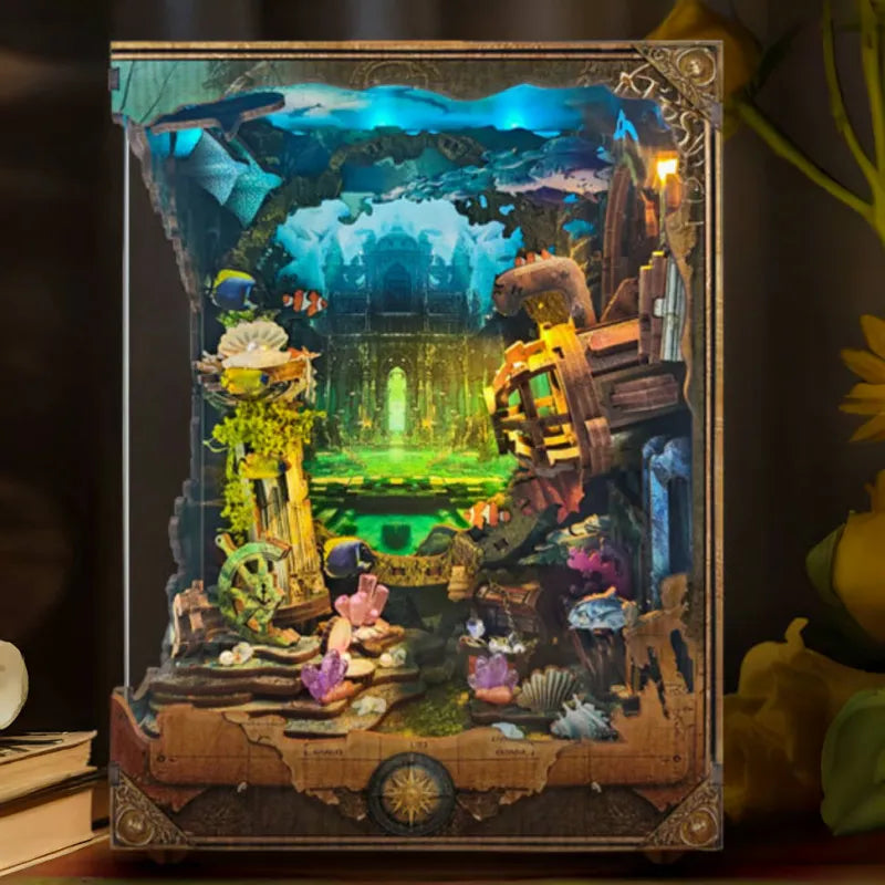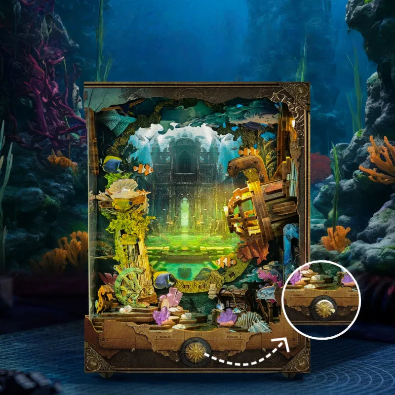 Sumérgete en la aventura de «Descubre Atlantis“, un Book Nook que trae la ciudad perdida directamente a su estantería. Un submarino de investigación ilumina con sus misteriosas luces LED de varios niveles las ruinas sumergidas y crea una mini escena cautivadora que estimula la imaginación e invita a soñar con mundos ocultos.